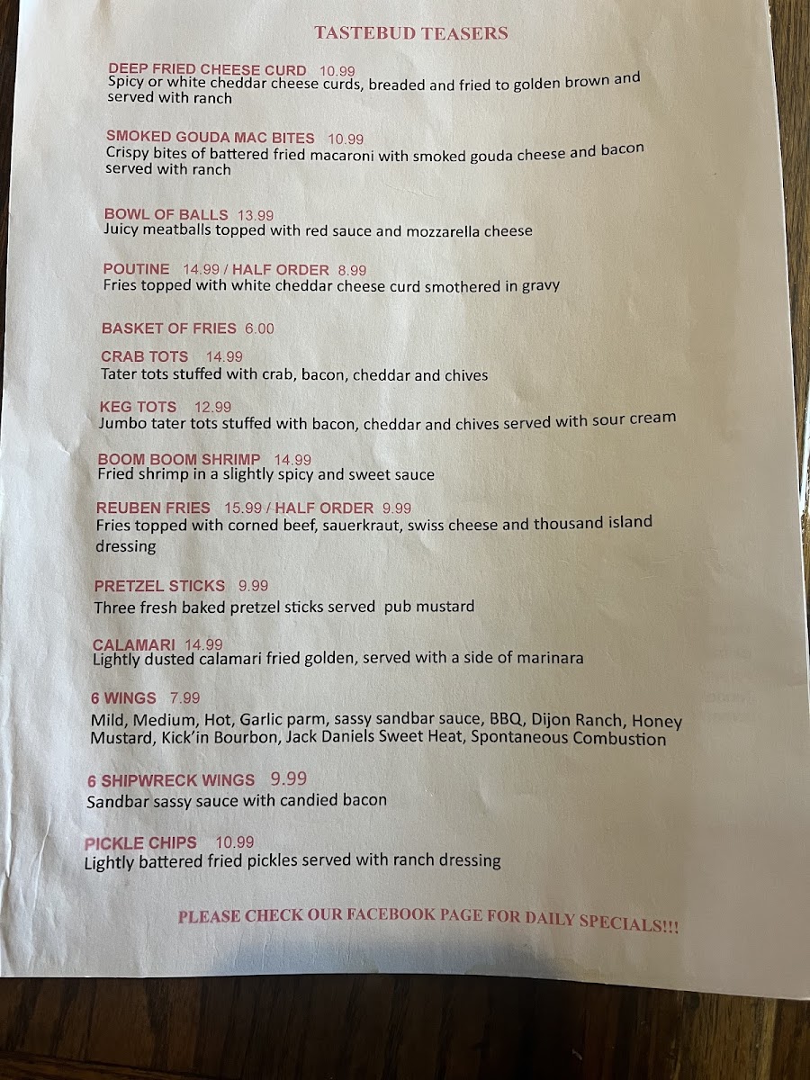 The ambiance is vibrant, often punctuated by live music, making it perfect for family gatherings or casual meals with friends. With menu highlights like Bowl of Balls and Keg Tots, there’s something to satisfy every craving. Whether you’re celebrating a special occasion or just enjoying a meal out, 3M's Sand Bar promises a warm, welcoming atmosphere and a satisfying culinary adventure.